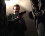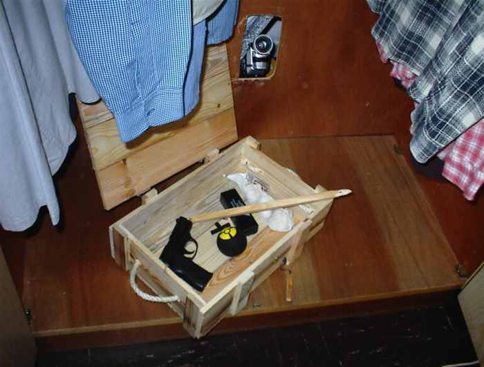 Interessant ist die Szene vor allem deswegen, weil sie aus einer Art 'Schrankperspektive' aufgenommen wurde, sich die Kamera also im (bzw. hinter) dem Schrank befand. Hierfür haben wir ein schönes, passendes Loch in die Rückwand des Schrankes gebohrt, durch das die Kamera, die sich den knappen Platz hinter dem Schrank mit dem Kameramann teilen musste, hindurchschauen konnte. Auf dem mittleren Foto unten ist die Kameraposition gut zu erkennen. Das Bild auf der linken Seite zeigt einen Frame des aufgezeichneten Videos. Das Bild rechts zeigt eine Aufnahme des Kameramanns, der sich bereits viel zu lange in der klaustrophobischen Enge hinter dem Schrank aufgehalten hatte.